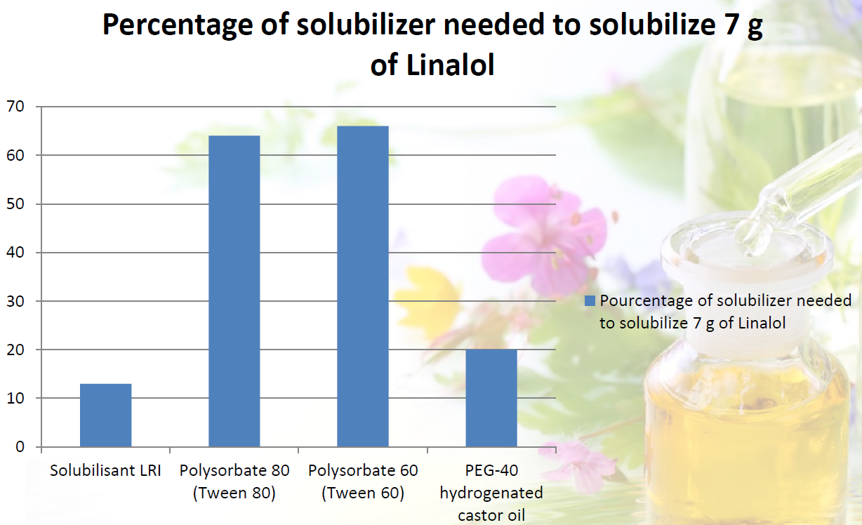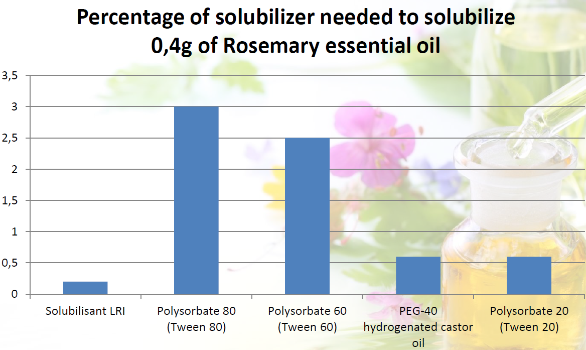 在溶解精油分子芳樟醇和迷迭香精油的比較中,SOLUBILISANT LRI的使用量遠遠低於Polysorbate 80 (Tween 80)和Polysorbate 60 (Tween 60),也贏過PEG-40 hydrogenated castor oil。