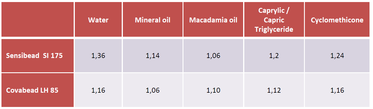 與著名的Covabead LH 85相比,Sensibead SI 175有更高的吸油吸水性,使用在配方中能夠吸附皮膚多餘油脂,顯著的增加持久性和無油乾爽。